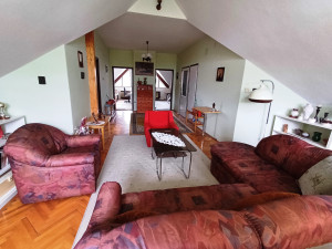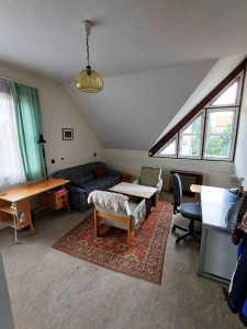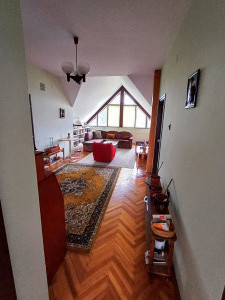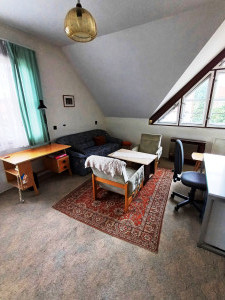 A nagyobb házrészben egy lépcsőházon keresztül jutunk a tágas tetőtérbe, amely ideális a családi élethez vagy vendégek fogadásához.