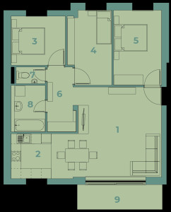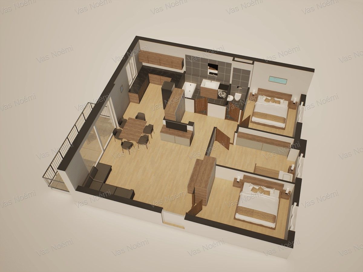 három hálószoba (9,6–12,9 m²)